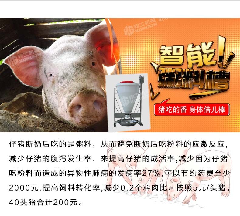 即便按照三個(gè)好處累加保育一次可以節(jié)約560元,一年按照使用粥料器保育6—8窩仔豬,累加一臺(tái)粥料器智能豬料槽通過在豬場(chǎng)的試驗(yàn)得出驗(yàn)證,解決了飼料轉(zhuǎn)化率,豬通過食料相比之前的飼喂每天多增重0.4斤,減少和杜絕了胃腸道病的發(fā)生幾率。合理采食的同時(shí)減少了飼料的浪費(fèi),省料即是省錢,普通的飼喂飼料浪費(fèi)率在5%-10%,豬場(chǎng)中使用了粥料器后飼料浪費(fèi)率控制在2%左右。減少人員的勞動(dòng)強(qiáng)度,夜晚無法定量投喂的問題。