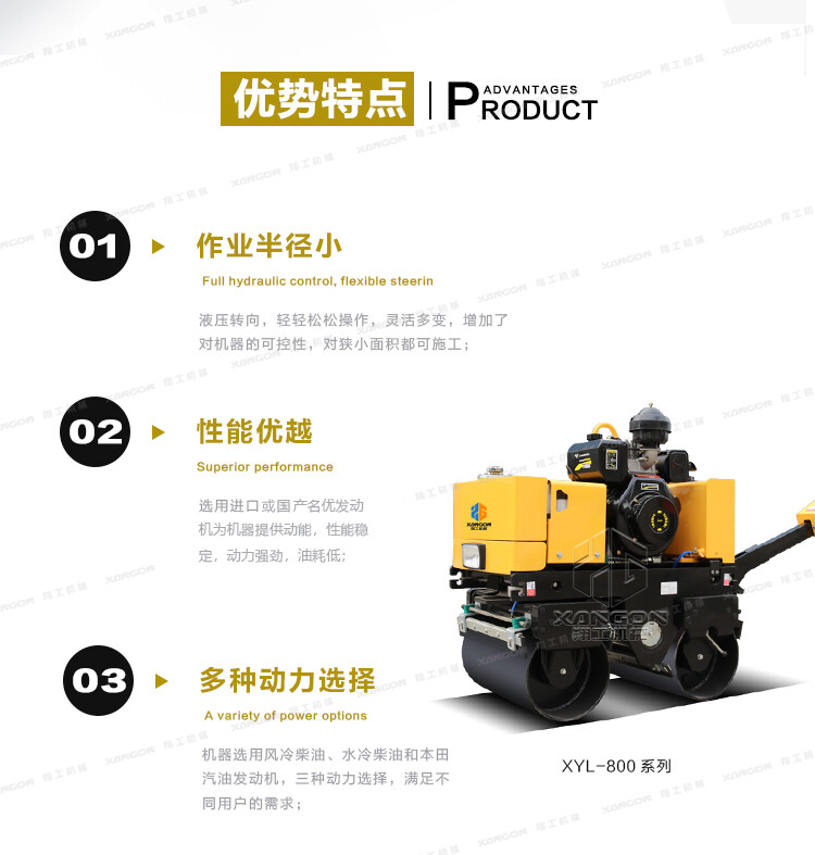 XYL-800C手扶全液壓壓路機(jī)(柴油)主要用于溝渠基礎(chǔ),道路,體育場地的壓實(shí)整平,也可用于壓實(shí)瀝青表面的作業(yè)。