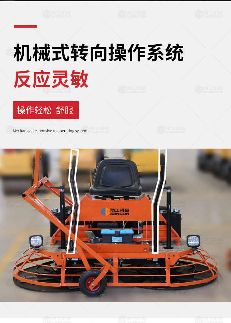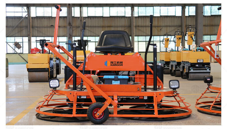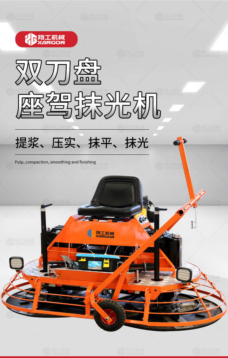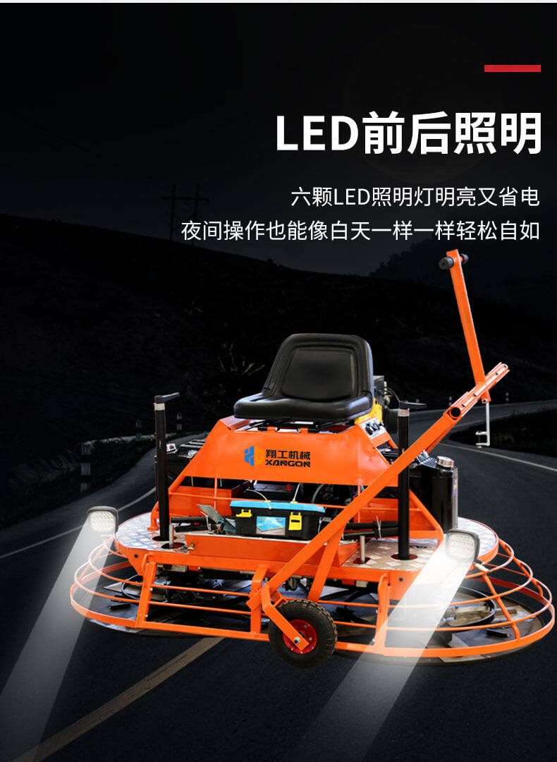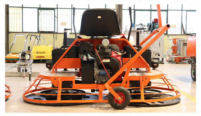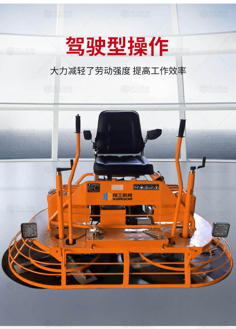 座駕式混凝土抹光機(jī)用于混凝土地面的提漿、壓實、抹平、抹光,相對于手扶式抹光機(jī),效率高。