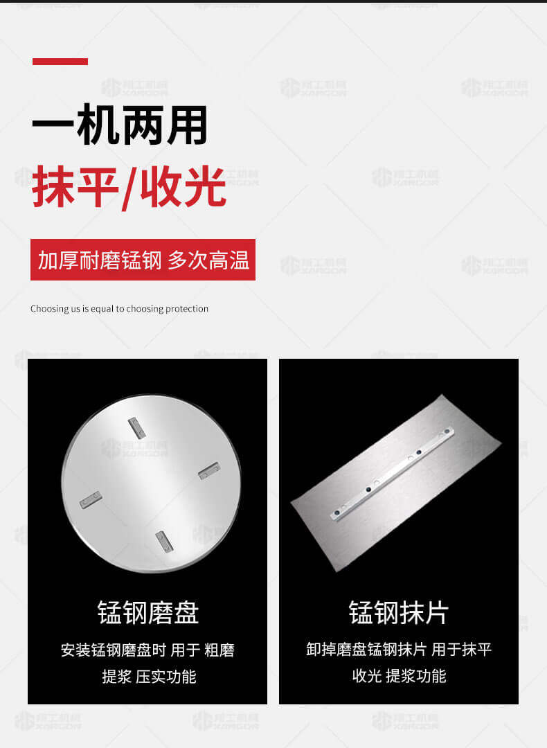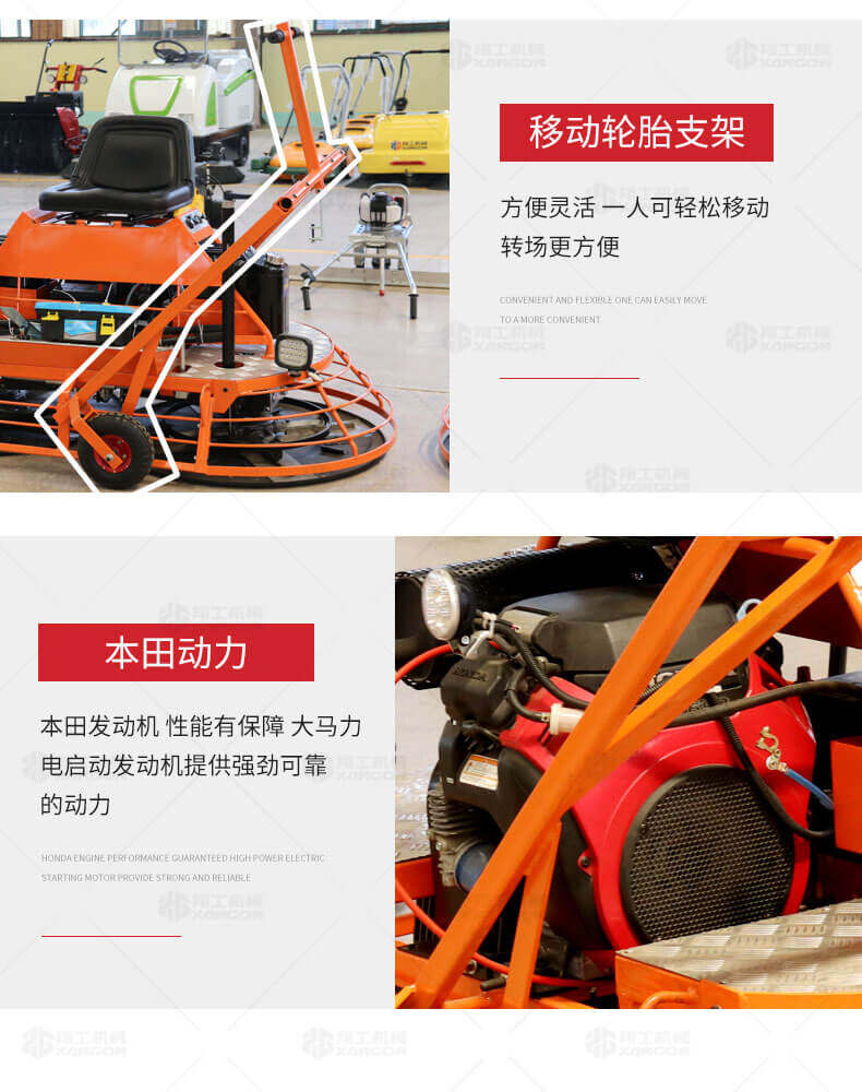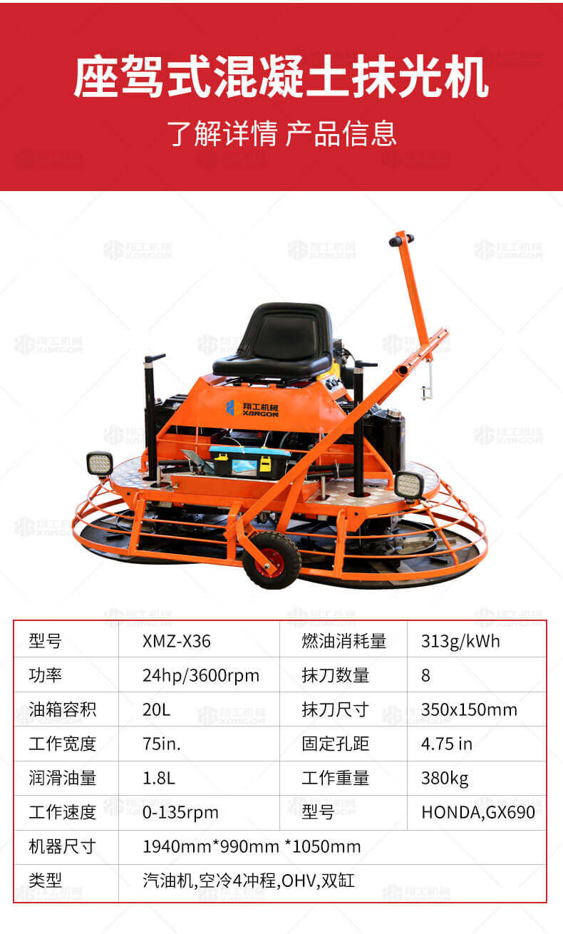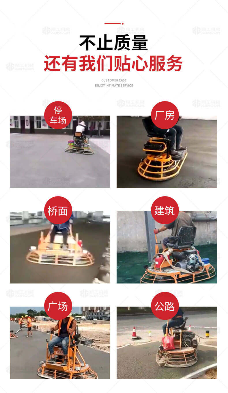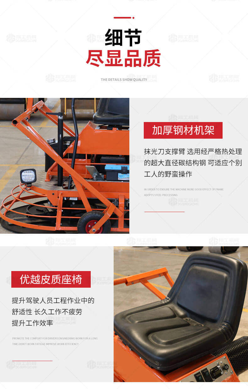 座駕式混凝土抹光機(jī)用于混凝土地面的提漿、壓實、抹平、抹光,相對于手扶式抹光機(jī),效率高。
