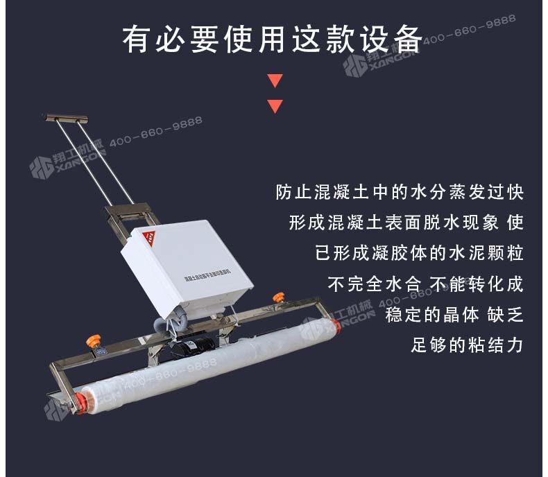 混凝土澆注后,如果養(yǎng)護不及時就容易產(chǎn)生一些不良效果,如氣候炎熱、空氣干燥等情況,我們就有必要使用這款設(shè)備,防止混凝土中的水分蒸發(fā)過快,形成混凝土表面脫水現(xiàn)象,使已形成凝膠體的水泥顆粒不完全水合,不能轉(zhuǎn)化成穩(wěn)定的晶體,缺乏足夠的粘結(jié)力。因此,混凝土表面會出現(xiàn)剝落或粉粒脫落。另外,當混凝土強度不夠時,過早蒸發(fā)水分會產(chǎn)生較大的收縮變形和干縮裂縫。因此,混凝土澆筑后的初期養(yǎng)護非常重要,終凝后應(yīng)立即進行養(yǎng)護。