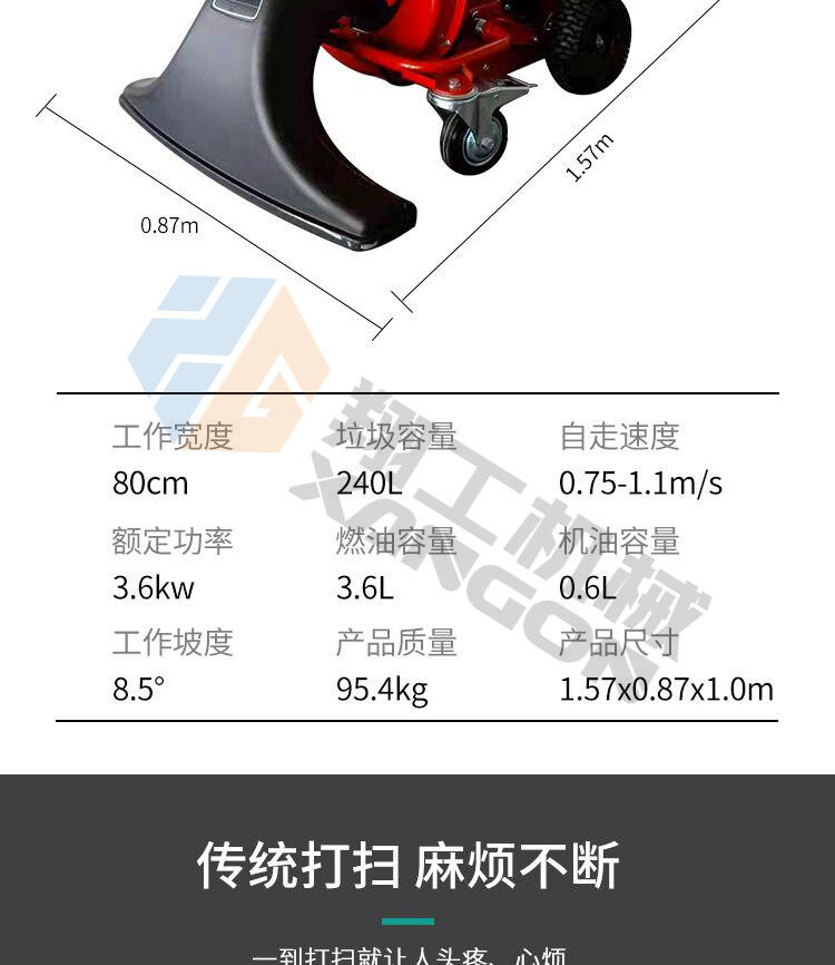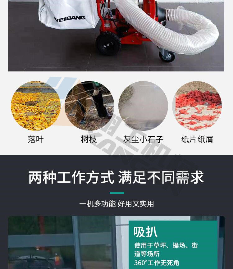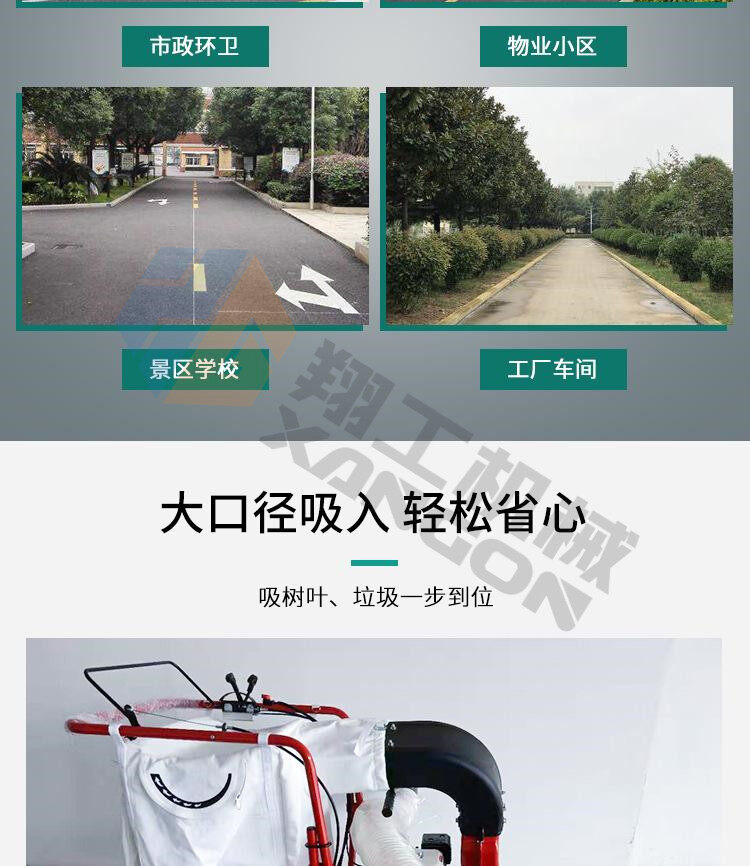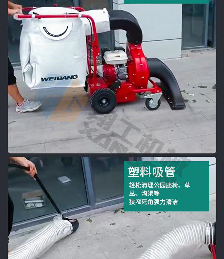 該設(shè)備工作效率高,比人工清掃效率高幾倍,可手推助力行走。垃圾儲(chǔ)存袋采用便捷式方式,便于更換垃圾,且使用成本較低。吸口可配置延長(zhǎng)管,用來吸收綠化帶中的落葉和垃圾。吸口高度可調(diào),面對(duì)落葉較厚或大的法桐樹葉較多的區(qū)域,也能輕松收集干凈。目前以用在環(huán)衛(wèi)人行道、園林、物業(yè)小區(qū)、校園、公園、廣場(chǎng)、工廠廠區(qū)和車間等得到廣泛應(yīng)用。