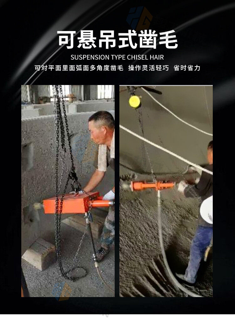 手持式懸掛鑿毛機(jī)機(jī)身有吊環(huán),鑿墻面的話吊起來使用,對(duì)平面、立面、弧形等多角度進(jìn)行鑿毛作業(yè),打擊力大、鑿深自如,應(yīng)用領(lǐng)域非常廣泛,又省力還方便。 主要適用于水庫、大壩滲漏,險(xiǎn)橋危橋、電廠、隧洞、高速公路、鐵路橋面以及箱梁混凝土等眾多領(lǐng)域 。主要是對(duì)混凝土表面進(jìn)行剔鑿,建筑物墻體、地面以及市政工程混凝土面層剔除、修補(bǔ)、翻新、加固等。