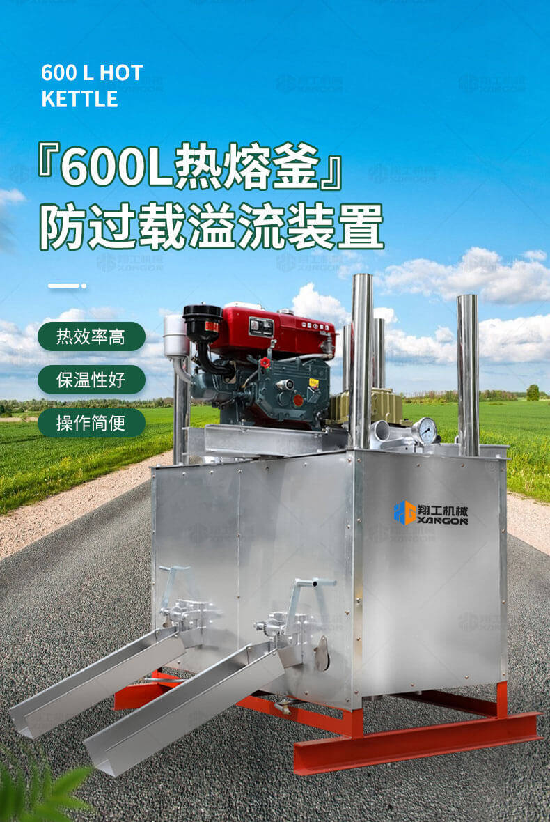 熱熔釜是一款熱熔標(biāo)線施工的主要設(shè)備之一。標(biāo)線施工時(shí),先利用熱熔釜將粉末狀涂料加熱,攪拌,直到熱熔變成液態(tài)后,再將涂料放入劃線機(jī)內(nèi)進(jìn)行劃線施工。
