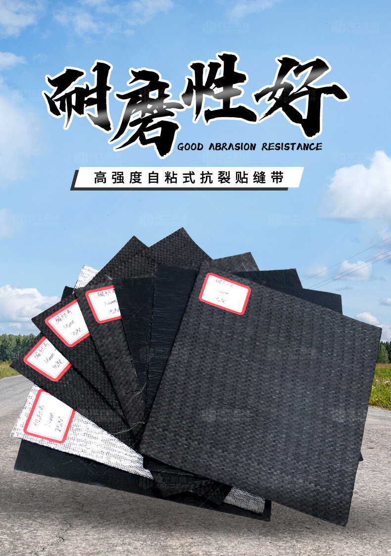 防裂貼(又稱(chēng)抗裂貼)是由瀝青基的高分子聚合物、抗拉胎基、耐高溫并與瀝青相容的織物復(fù)合而成。將其貼于產(chǎn)生裂縫或剝落的瀝青混泥土面,能減少并阻隔其作用于路面的溫縮應(yīng)力,因此也減少了裂縫反射穿過(guò)面層的趨勢(shì),鋪設(shè)與路面因其將基層與上部磨耗層隔離開(kāi)來(lái),從而使上面層免受多向位移及剪切應(yīng)力的影響,用于公路、橋梁、機(jī)場(chǎng)等。