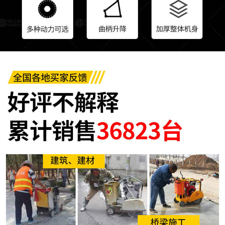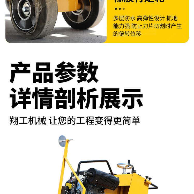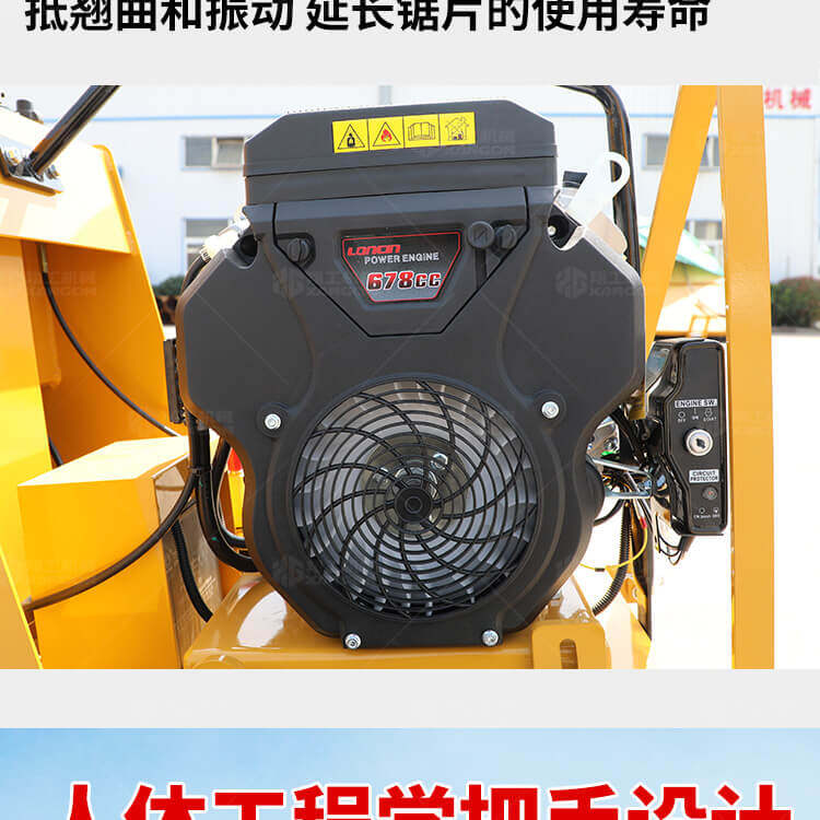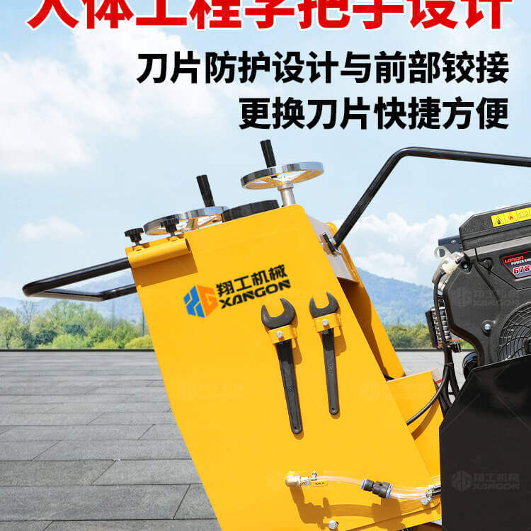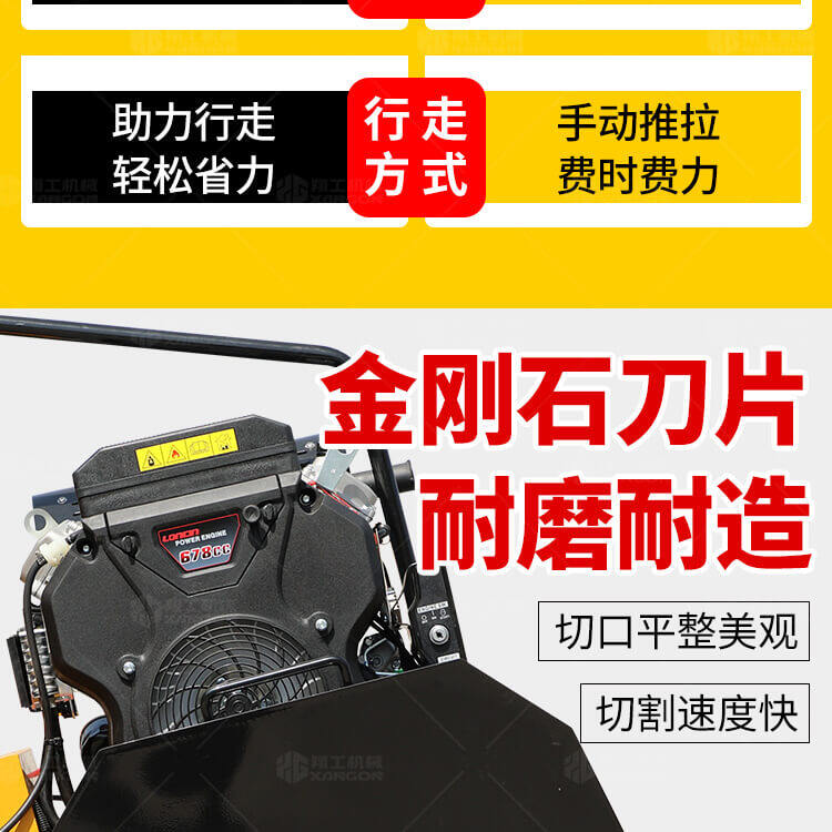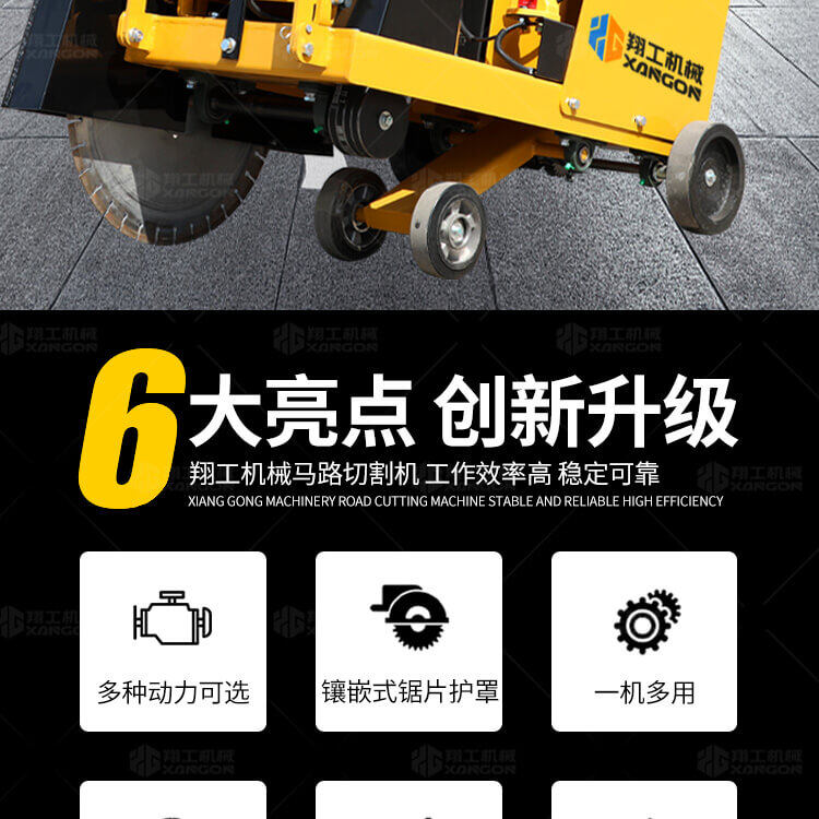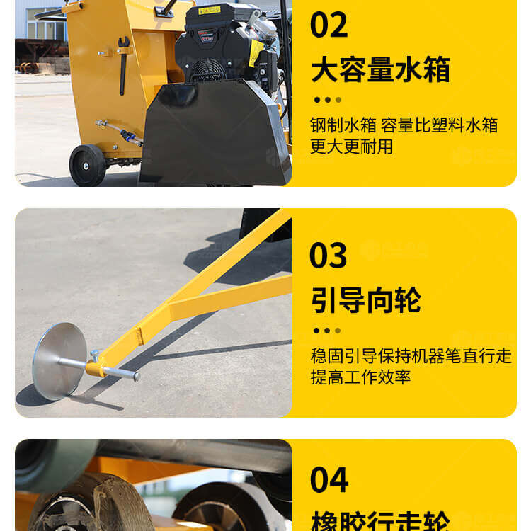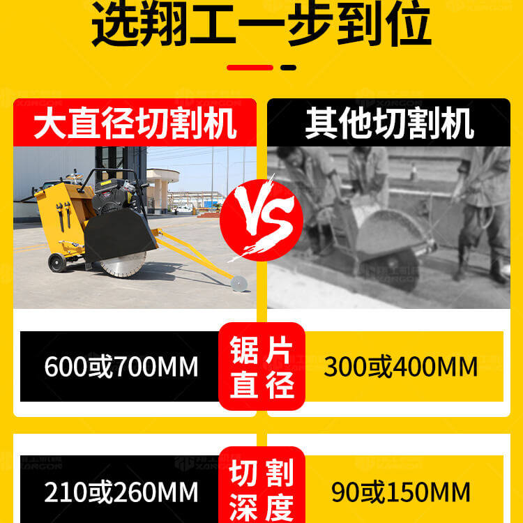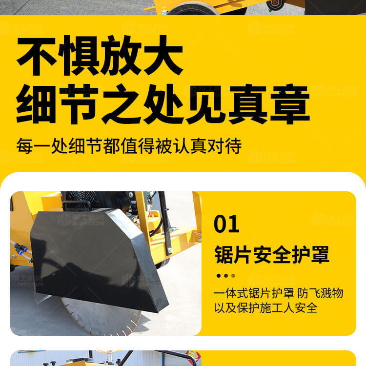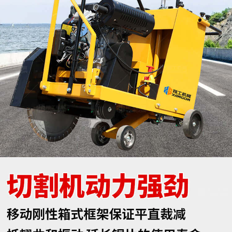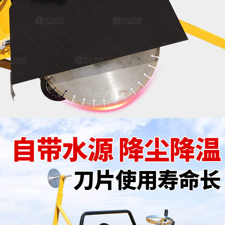 大鋸片大直經(jīng)馬路切割機(jī)自帶水源,降塵降溫,刀片使用壽命長。