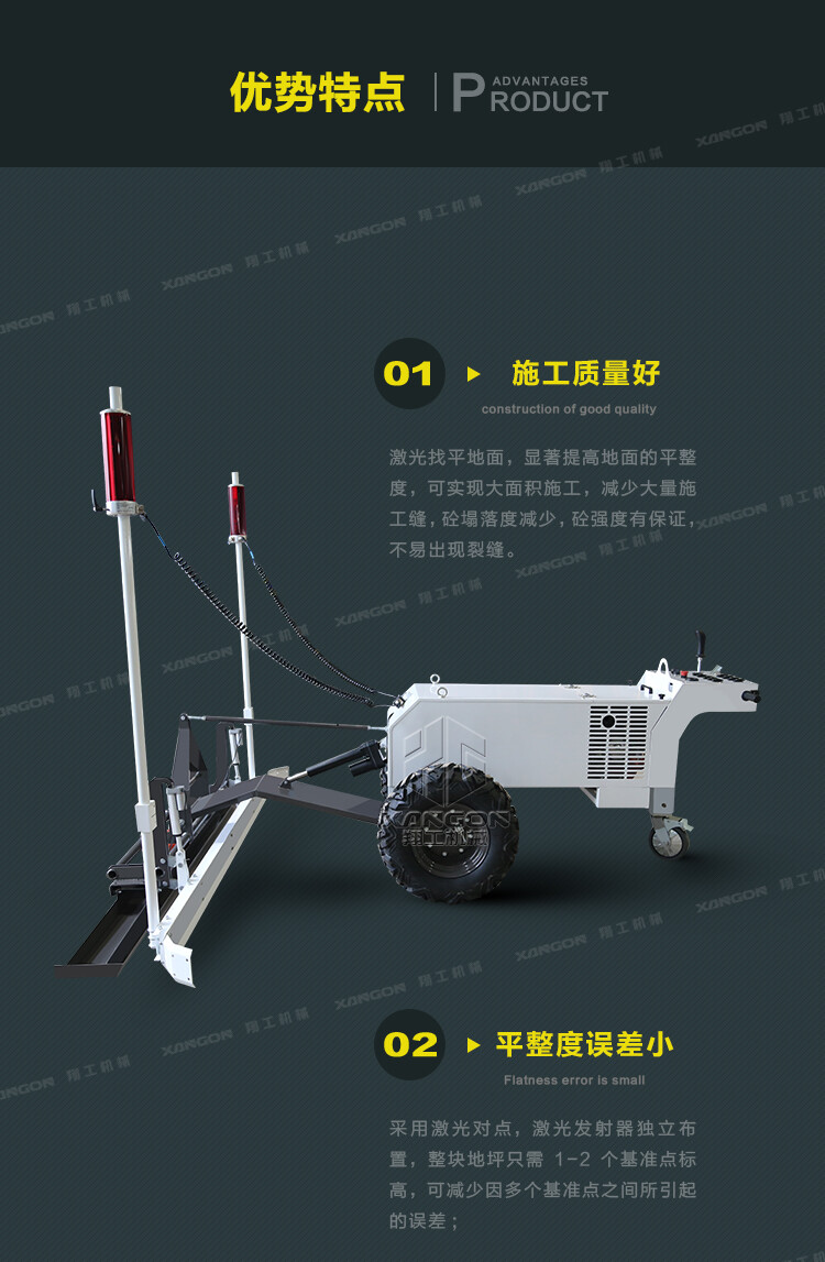 2,本產(chǎn)品的激光控制系統(tǒng)通過反饋調(diào)節(jié),實時監(jiān)控地坪的標高,確保地坪的水平平整度和保證地坪的密實均勻;