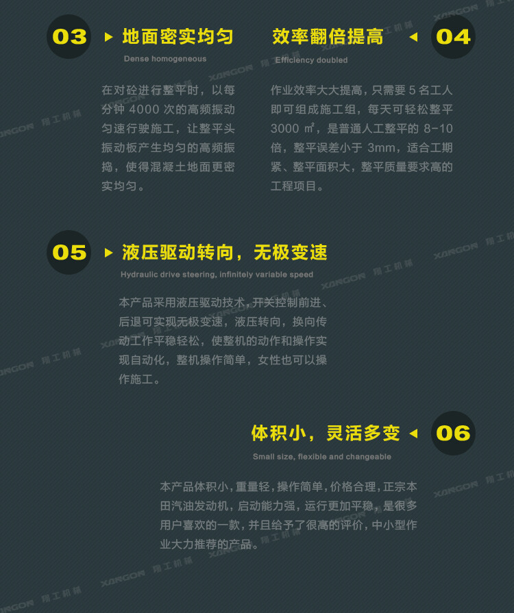 3,本產(chǎn)品能一次性鋪設混凝土基層,將其抹平將其震蕩光滑,您的工作速度將大大提高,因為該機器自動設定標高,使得操作員快速的通過工作區(qū)域;