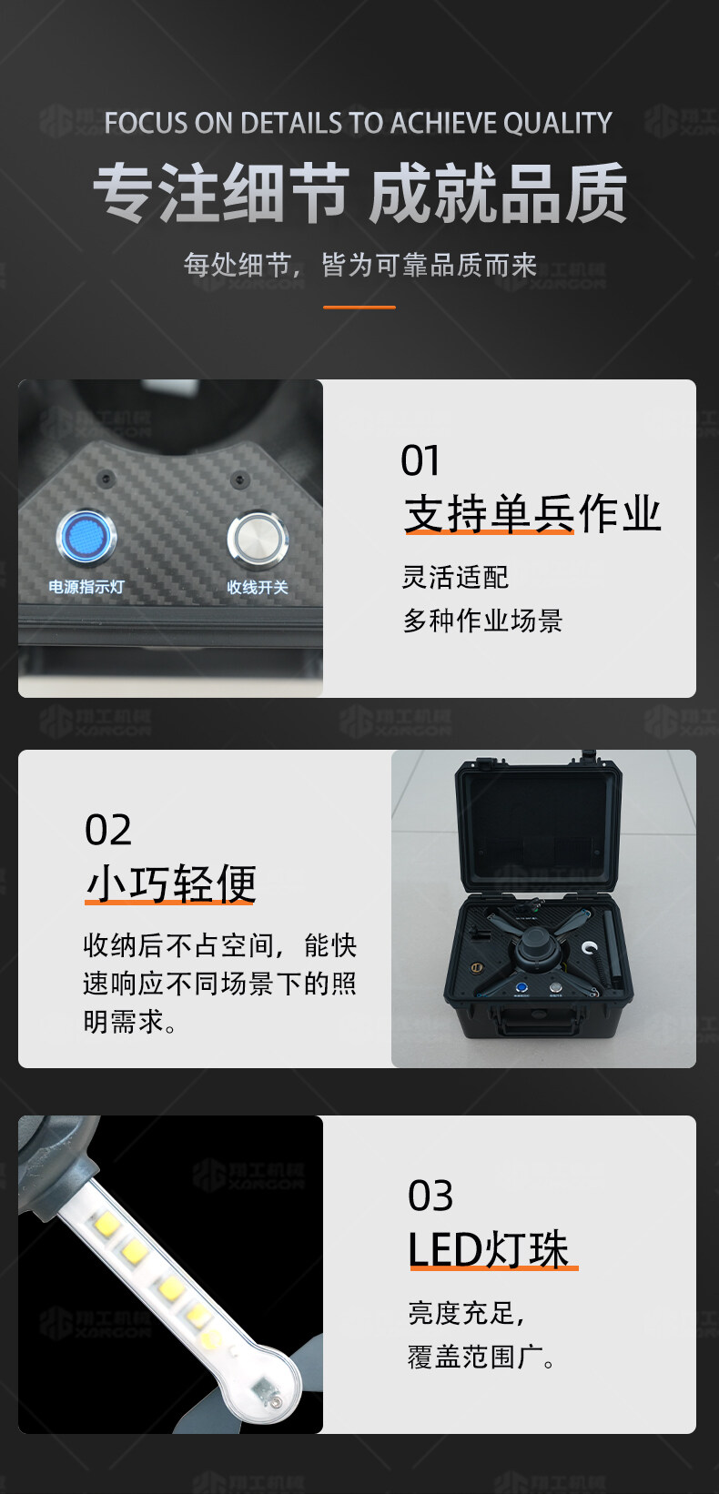 本產(chǎn)品是一款集無人機(jī)與強(qiáng)光照明于一體的移動(dòng)應(yīng)急裝備。采用便攜折疊設(shè)計(jì),可快速部署升空,提供高空廣域照明。具備長(zhǎng)續(xù)航、高亮度、抗風(fēng)穩(wěn)像等特點(diǎn),廣泛適用于夜間救援、工程搶險(xiǎn)、警勤巡邏及大型活動(dòng)保障等場(chǎng)景,是提升夜間作業(yè)效率與安全的理想選擇。