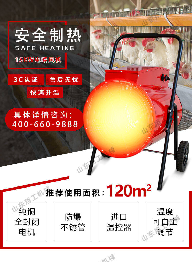 15KW電暖風(fēng)機(jī)優(yōu)點(diǎn): 1、純銅全封閉電機(jī) 2、防爆不銹管(不銹管發(fā)熱元件作熱源保證產(chǎn)品的可靠) 3、取暖溫度可自動(dòng)調(diào)節(jié)(調(diào)節(jié)功率) 4、進(jìn)口溫控器 5、外殼絕緣,防水