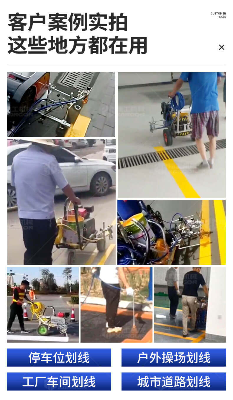 小型手推式道路劃線機(jī)是一種在道路、停車場(chǎng)、廣場(chǎng)和跑道等平整地面上劃出不同約束、指引和警示等規(guī)則限制標(biāo)志的路面施工機(jī)械。最常見(jiàn)的就是在馬路上劃斑馬線,在路上劃車庫(kù)線、停車線等等應(yīng)用于小型工程、短途施工,活動(dòng)方便,靈活操作。