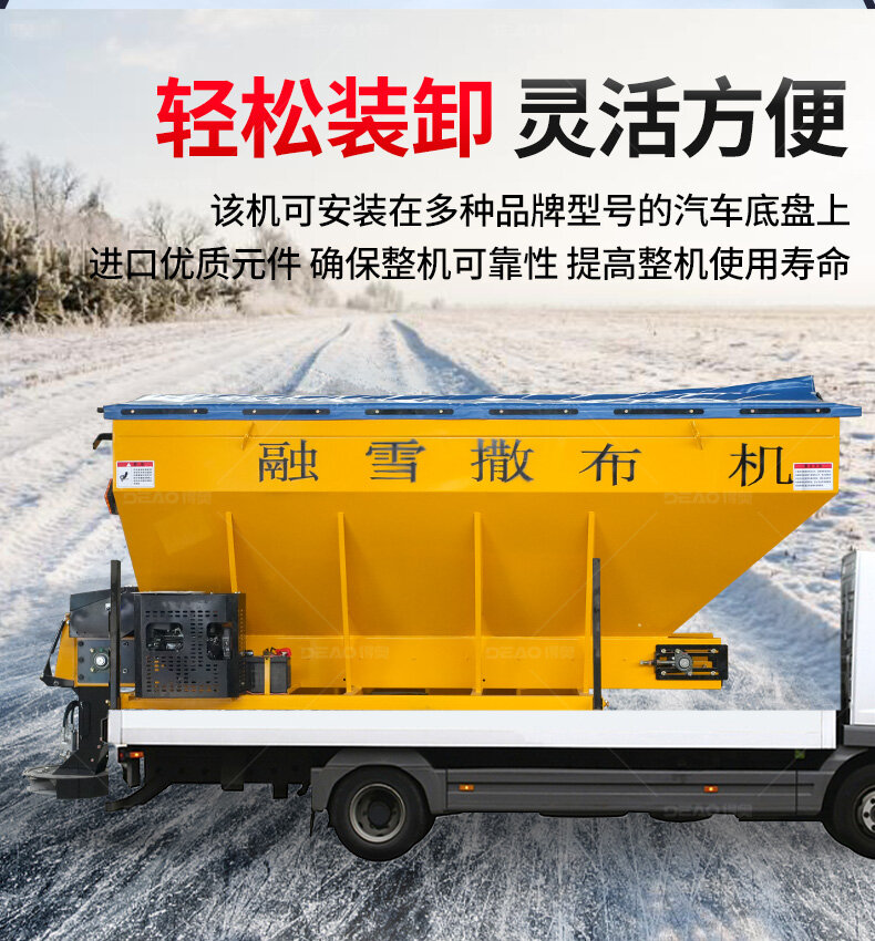融雪劑撒布機(jī)是車載式撒布機(jī),適用于冰雪路面防滑沙料和融雪劑的撒布,是市政公路、高速公路的融雪撒布的便利設(shè)備。